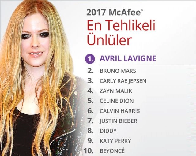 "McAfee En Tehlikeli Ünlüler Listesi" açıklandı. Bu yılın en tehlikeli ünlüsü Avril Lavigne oldu. McAfee, "En Tehlikeli Ünlüler" listesinin 11.'sini açıkladı. Listede Kanadalı şarkıcı Avril Lavigne, 2017 yılı internet aramalarında zararlı internet siteleri ve yazılımlara en çok yönlendirme potansiyeli taşıyan ünlü olarak birinci sırada yer aldı. Önceki yıllardaki araştırmalardan farklı olarak bu yıl, listede ağırlıklı olarak müzisyenlerin bulunması dikkat çekti. "Ünlü İsmi + free mp3 (bedava mp3)" aramasının ise en çok tehlike taşıyan arama kelimeleri olduğu belirlendi. İKİNCİ SIRADA BRUNO MARS VARDünyada 40 milyondan fazla albümü satılmış, Kanada'nın dünya çapında en çok satış rakamına ulaşmış ikinci müzisyeni olan Avril Lavigne, bu listede zirvede yer alan ilk kadın olarak da öne çıktı. Bruno Mars, bu yıl ilk kez yer aldığı listeye ikinci sıradan girdi. Listedeki diğer ünlüler ise sırasıyla Carly Rae Jepsen, Zayn Malik, Celine Dion, Calvin Harris, Justin Bieber, Diddy, Katy Perry ve Beyonce oldu."En Tehlikeli Ünlüler" çalışmasını değerlendiren McAfee Baş Güvenlik Yöneticisi Gary Davis, "Günümüz dijital dünyasında, beğenilen ünlülerin videolarını, filmlerini, müziklerini, elektronik cihazlara hızlıca indirme isteğinin, güvenlik gereksiniminin önüne geçtiğine şahit oluyoruz. İnternet kullanımında yavaşlamak, indirilebilir içeriklere ulaşırken kullanılan bağlantılara dair risklerin farkına varmak, herhangi bir linke tıklamadan önce bir kez daha düşünmek, çevrimiçi güvenlikte önemli bir unsurdur" dedi.