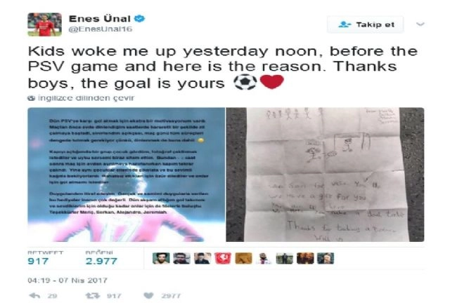 Hollanda Ligi ekiplerinden Twente'de forma giyen Enes Ünal, PSV Eindhoven karşısında attığı golü 4 minik hayranına hediye ettiğini açıkladı. Twente formasıyla başarılı bir grafik yakalayan milli futbolcu Enes, takımının PSV Eindhoven ile oynadığı maçtan önce yaşadığı bir olayla ilgili sosyal medya hesabından açıklama yaptı. Genç futbolcu, maçtan önce 4 çocuk hayranından aldığı hediyenin, PSV maçında gol atmasında önemli bir motivasyon sağladığını söyledi.Enes Ünal'ın sosyal medya hesabından yaptığı açıklama şöyle:"Dün PSV'ye karşı gol atmak için ekstra bir motivasyonum vardı. Maçtan önce evde dinlendiğim saatlerde hararetli bir şekilde zil çalmaya başladı. Sinirlendim açıkçası. Maç günü tüm süreçleri dengede tutmak gerekiyor çünkü. Dinlenmek de buna dahil. Kapıyı açtığımda bir grup çocuk gördüm, fotoğraf çektirmek istediler ve uyku sersemi biraz sitem ettim. Bundan 1-2 saat sonra maç için evden ayrılmaya hazırlanırken kapım tekrar çalındı. Yine aynı çocuklar ellerinde çikolata ve bu sevimli kağıtla bekliyorlardı. Rahatsız ettikleri için özür dilediler ve onlar için gol atmamı istediler. Duygulandım, itiraf edeyim. Gerçek ve samimi duygularla verilen bu hediyeler inanın çok değerli. Dün akşam attığım gol takımın ve sevdiklerim için olduğu kadar onlar için de filelerle buluştu. Teşekkürler; 'Meriç, Serkan, Alejandro, Jeremiah."