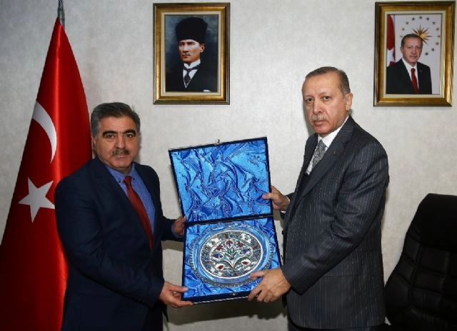 Cumhurbaşkanı Recep Tayyip Erdoğan, 6. Olağan İl Kongresi için gittiği Amasya'da Vali Osman Varol ve Belediye Başkanı Cafer Özdemir'i kabul etti. Vali Varol ve Başkan Özdemir Cumhurbaşkanı Erdoğan'a Türk süsleme sanatı ile yapılmış tabak hediye etti. (Murat Çelik - Kenan Akyüz/İHA)