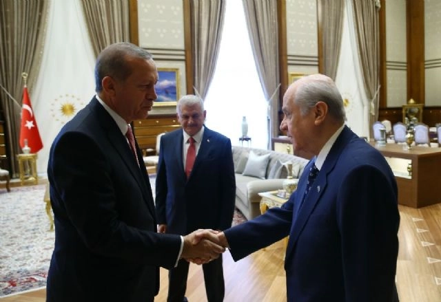 Cumhurbaşkanı Recep Tayyip Erdoğan, MHP Genel Başkanı Devlet Bahçeli ile görüşüyor.