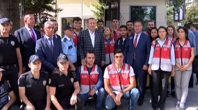 Cumhurbaşkanı Recep Tayyip Erdoğan, Kısıklı'daki ikametinden Huber Köşkü'ne geçerken yolda emniyet mensupları ve vatandaşlarla bayramlaştı. Cumhurbaşkanı Recep Tayyip Erdoğan, bayram namazını Üsküdar'da bulunan Hz. Ali Camii'nde kıldı. Buradan Kısıklı'daki ikametine geçen Erdoğan, kısa süre sonra Huber Köşkü'ne gitmek üzere yola çıktı. Sarıyer'de bir taksi durağına uğrayan Erdoğan taksicilerle bayramlaştı. Ardından, Sarıyer İlçe Emniyet Müdürlüğü Şehit Kemal Aykut Genç karakolunun önünde duran Cumhurbaşkanı Erdoğan, burada da emniyet mensuplarıyla bayramlaştı. Daha sonra vatandaşlarla da bayramlaşan Erdoğan, emniyet mensuplarıyla hatıra fotoğrafı çektirdi. Erdoğan, Huber Köşkü'ne gitmek üzere karakoldan ayrıldı.(Metin Başar/İHA)