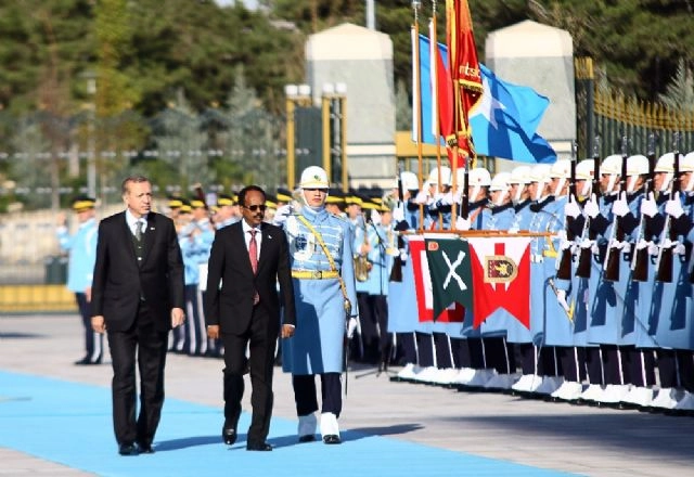 Cumhurbaşkanı Recep Tayyip Erdoğan, Somali Cumhurbaşkanı Mohamed Abdullahi Farmajo'yu resmi törenle karşıladı. Cumhurbaşkanı Erdoğan, atlı birlikler eşliğinde Cumhurbaşkanlığı Külliyesi'ne gelen konuk Cumhurbaşkanı Farmajo'yu Külliye girişinde karşıladı. İki ülke milli marşlarının 21 pare top atışı eşliğinde çalınmasının ardından Somali Cumhurbaşkanı Mohamed Abdullahi Farmajo tören kıtasını selamladı. Her iki ülke bakan ve bürokratlarının takdiminin ardından cumhurbaşkanları gazetecilere poz verdi.Baş başa ve heyetler arası görüşmelerin ardından yapılan anlaşmalar için imza töreni ve ortak basın toplantısı düzenlenecek. Erdoğan, konuk Cumhurbaşkanı Mohamed Abdullahi Farmajo ile resmi akşam yemeğini Cumhurbaşkanlığı Külliyesi'nde yiyecek.(Derya Yetim / İHA)