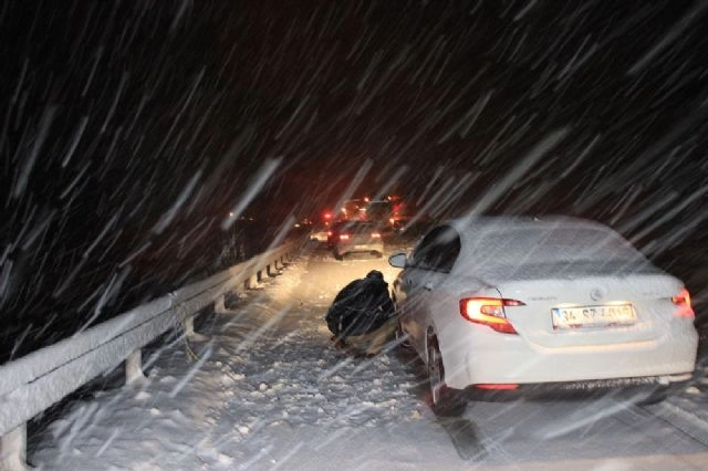 Erzincan'da yüksek kesimlerde etkili olan yoğun kar yağışı ve tipi nedeniyle Erzincan-Sivas karayolu ulaşıma kapandı. Yoğun kar ve tipi nedeniyle Erzincan Sivas karayolu ulaşıma kapandı. Sakaltutan mevkiinde tipi nedeniyle görüş mesafesi azalırken kar kalınlığının 20 santimetreyi geçti. Vatandaşlar, saatlerce araçlarında yolun açılmasını bekledi. Yolda küçük çaplı kazalar da meydana gelirken karayolları ekipleri ve polis ekipleri yolun ulaşıma açılabilmesi için yoğun çaba sarf etti. (Abdullah Aslan/İHA)