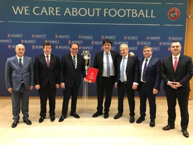 Türkiye Futbol Federasyonu, EURO 2024'e ev sahipliği yapmak için resmi adaylık başvurusunu yaptı.Türkiye Futbol Federasyonu Başkanı Yıldırım Demirören, EURO 2024 ev sahipliği için resmi başvuru dosyasını UEFA Genel Sekreteri Theodore Theodoridis'e, UEFA'nın İsviçre'nin Nyon kentindeki idari merkezinde teslim etti.EURO 2024 adaylığı için resmi başvuru sırasında, TFF 1. Başkanvekili Servet Yardımcı, Yönetim Kurulu üyeleri Cengiz Zülfikaroğlu, Mustafa Çağlar, Alaattin Aykaç ve Genel Sekreter Kadir Kardaş da hazır bulundu.