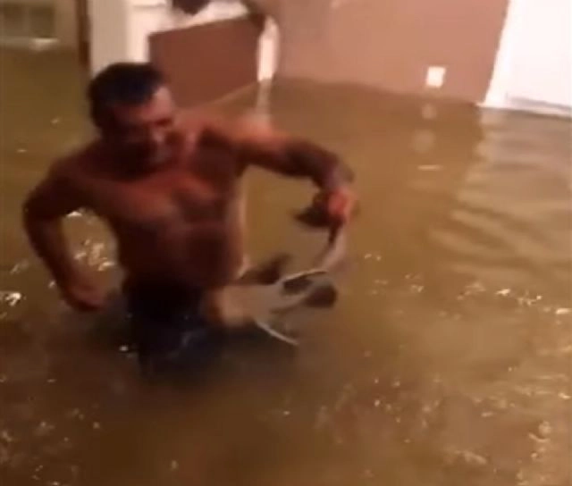 ABD'nin Teksas eyaletine bağlı Houston şehri Harvey kasırgasıyla boğuşurken, ortaya ilginç görüntüler de çıkıyor. Tıpkı evini su basan bu adamın balık avı gibi.Evine gelen davetsiz konuğu uzun süre kovalayan adam, en sonunda onu tutmayı başarıyor. Başta oluşan şaşkınlıksa yerini kahkahalara bırakıyor.