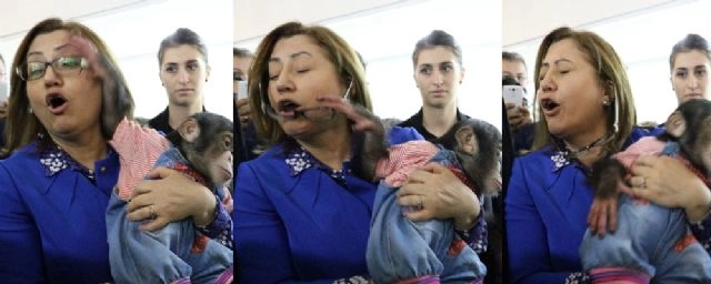 Gaziantep Büyükşehir Belediye Başkanı Fatma Şahin, Hayvanat Bahçesi'nin maskotu şempanze Can'ı sevmeye çalışırken beklenmedik bir tepki gördü.Gaziantep Hayvanat Bahçesi'nde doğan ve Hayvanat Bahçesi'nin maskotu haline gelen şempanzeye Büyükşehir Belediye Başkanı Fatma Şahin tarafından Can ismi verilmişti. Zooloji ve doğa müzesi açılışına katılan Şahin karşısında şempanze Can'ı görünce kucağına aldı. Bir süre küçük şempanzeyi seven Başkan Şahin, beklenmedik bir tepki ile karşılaştı. Can'ın attığı tokat sonrası Belediye Başkanı Şahin'in gözlüğü düştü. Tepkiye rağmen küçük şempanzeyi bırakmayan Şahin, Can'ı severek sakinleştirdi.(Lider Olgun / İHA)
