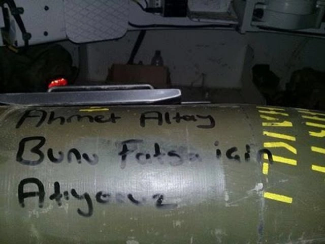 Türk Silahlı Kuvvetlerinin Afrin'de düzenlediği Zeytin Dalı Harekatı'na katılan Ordu-Fatsalı bir askerin bombaya yazdığı yazı, sosyal medyayı salladı. Ordu'nun Fatsa ilçesinden olduğu belirlenen asker, bombanın üzerine yazdığı yazı ile İHA Fatsa Muhabiri Ahmet Altay'a seslendi ve "Bunu Fatsa için atıyoruz" diye yazdı. Sosyal medyaya düşen fotoğraf bir anda yüzlerce sosyal medya kullanıcısı tarafından paylaşılmaya başlandı. Paylaşımlara yorum yapan vatandaşlar Afrin'deki Türk askerlerine dualarını eksik etmedi.(Metin Akyürek/İHA)
