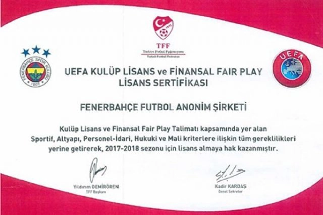 Fenerbahçe, Türkiye Futbol Federasyonu'ndan (TFF) UEFA Kulüp Lisans ve Finansal Fair Play Lisans Sertifikası almaya hak kazandı. Geçtiğimiz sezonlarda Finansal Fair Play ile sıkıntı yaşayan Fenerbahçe, Türkiye Futbol Federasyonu Kulüp Lisans Kurulu kararı neticesinde UEFA Kulüp Lisans ve Finansal Fair Play Lisans Sertifikası almaya hak kazandı. Sarı-lacivertlilere gönderilen evrakta, TFF'nin aldığı kararı içeren yazı ile beraber lisans belgeleri de kulübe iletildi. UEFA Lisans Sertifikası'nda yer alan metinde, "Fenerbahçe Futbol A.Ş., Kulüp Lisans ve Finansal Fair Play Talimatı kapsamında yer alan Sportif, Altyapı, Personel- İdari, Hukuki ve Mali kriterlere ilişkin tüm gereklilikleri yerine getirerek, 2017-2018 sezonu için lisans almaya hak kazanmıştır" ifadeleri yer aldı.