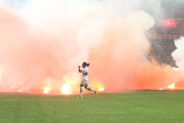 TFF 1. Lig Play-Off Final maçı Eskişehirspor-Göztepe karşılaşması başladığından kısa süre sonra sahaya atılan yabancı maddeler yüzünden durdu. Süper Lig'e çıkmak için mücadele veren iki takımın taraftarları kendilerine ayrılan tribünleri tamamen doldurdu. Takımlarını maçtan saatler öncesinden desteklemeye başlayan Eskişehirspor ve Göztepeli taraftarlar maçtan önce Antalya sokaklarında renkli görüntüler oluşturdu. Bazı taraftarlar stadyum önünde meşaleler yakarken, bazıları da maytaplar patlattı. Zaman zaman iki takım taraftarları karşı karşıya da gelirken kavga durumları meydana geldi.Maç esnasında ise, iki takımın taraftarları stadyum içerisine çok sayıda meşale ve maytap sokarken, bunları sahaya attılar. Eskişehirspor ve Göztepeli taraftarlar meşale ve maytapları stadyuma sandviç ekmekleri içerisinde sokmaya çalıştıkları gözlendi. Bazı taraftarlar meşale ve maytapları içeriye sokabilirken, bazıları da bu denemelerinde başarısız oldu.MAÇ MEŞALE VE MAYTAPLARDAN DOLAYI DURDUMaçın başlamasıyla beraber iki takımın taraftarlarının sahaya attığı meşale ve maytaplardan dolayı maç, mücadelenin hakemi Ali palabıyık tarafından 9 dakika durduruldu. Maçın durmasıyla beraber saha kenarına Çevik Kuvvet polisleri geldi. Meşale ve maytaplardan dolayı oluşan duman bulutunun dağılmasından sonra mücadele kaldığı yerden devam etti. Taraftarlar tarafından sahaya atılan meşale ve maytaplardan dolayı da çimlerin bir kısmının yandığı görüldü.MAÇ İKİNCİ KEZ DURDUMücadelenin 27. dakikasında Eskişehirspor taraftarlarının sahaya attığı meşale ve maytaplardan dolayı maç ikinci kez durdu. Hakem Ali Palabıyık yardımcı hakemlerini yanına çağırdı ve mücadeleyi 6 dakika durdurdu. Atılan meşalelerden ve maytaplardan dolayı bir Eskişehirspor taraftarı yaralandı. Yaralanan taraftara sağlık ekipleri hemen müdahale etti.MÜCADELE 3. KEZ MEŞALE VE MAYTAPLARDAN DOLAYI DURDUBu sefer de 35. dakikada Göztepe taraftarlarının sahaya maytap ve meşale atmasından dolayı oyun durdu. Maçın hakemi Ali Palabıyık yardımcılarını bir kez daha yanına çağırdı. Futbolcular taraftarlara meşale ve maytap atmamaları konusunda uyarılarda bulundu. Maç 3 dakika sonra kaldığı yerden devam etti. Mücadele ilk yarıda sahaya atılan meşale ve maytaplardan dolayı hakem Ali Palabıyık tarafından toplamda 18 dakika durduruldu. Mücadele 18 dakika dururken ilk yarının sonuna hakem tarafından 17 dakika uzatma verildi.GÖZTEPE'DE YEDEK KALECİ SARI KART GÖRDÜ45+15. dakikada Göztepe'de yedek kaleci Mehmet Göktuğ top taca çıktıktan sonra Ofoedu'ya topu vermeyince iki oyuncu arasında tartışma yaşandı. Diğer oyuncularında olaya müdahalesiyle kısa süreli bir tartışma yaşandı. Hakem Ali Palabıyık iki oyuncuya da sarı kart verdi.ANTALYA EMNİYETİNDEN BİR İLKÖte yandan Antalya İl Emniyet Müdürlüğü ekipleri ilk kez bu sezon stadyum içerisinde tribünlerden sahaya giriş ihtimallerine ve olası tatsız bir durumun yaşanmaması için saha etraflarını demir bariyerlerle kapattı. Çevik kuvvet ekipleri ise tribünler önünde maç bitimine kadar güvenlik önlemleri aldı. Mücadeleyi izlemeye gelenler arasında Kültür ve Turizm Bakanı Nabi Avcı da yer aldı.