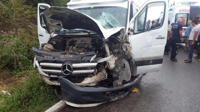 Sakarya'nın Kocaali ilçesinde fındık işçilerini taşıyan servis minibüsü ile iş makinesi kafa kafaya çarpıştı. Kazada, 15 kişi yaralandı.