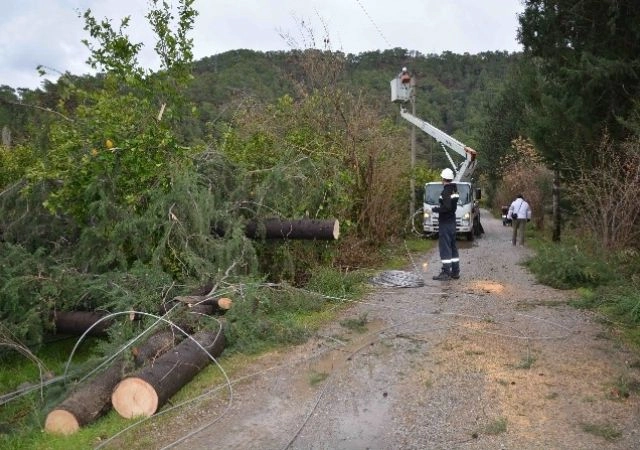Muğla'nın Ortaca ve Köyceğiz ilçelerinde geceden beri etkili olan fırtına ve lodos nedeniyle elektrik telleri koptu, ağaçlar devrildi.