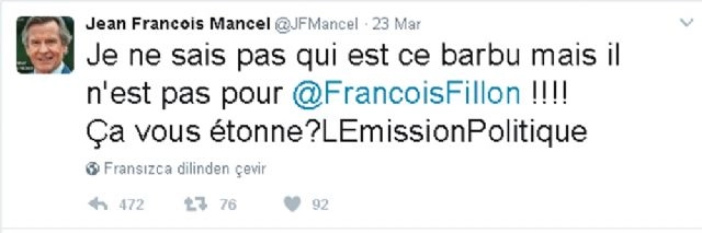 Cumhuriyetçiler Partisinin Milletvekili Jean-François Mancel, partisinin adayı François Fillon ile röportaj yapan Faslı Karim Rissouli hakkındaki ırkçı tweet'i ile tepki çekti.