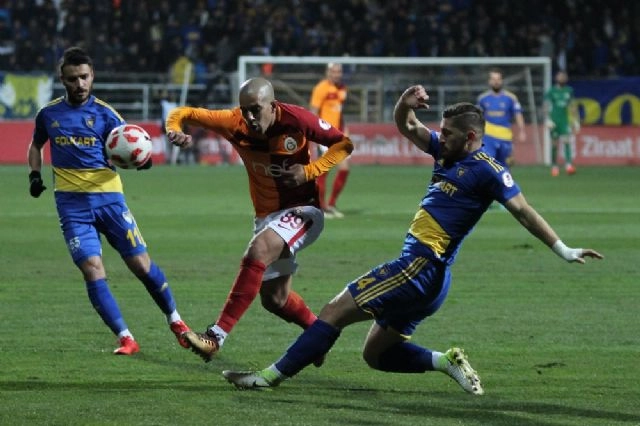 Ziraat Türkiye Kupası Son 16 Turu rövanş maçında Bucaspor, Galatasaray'ı konuk ediyor. Mücadelenin ilk yarısı sarı-kırmızılı takımın 2-0 üstünlüğü ile sona erdi.MAÇTAN DAKİKALAR24. dakikada Feghouli'nin sağ kanattan ceza sahasına ortasında Gomis topa vurmakta gecikince savunma tehlikeyi uzaklaştırdı.26 dakikada ceza sahası içinde topla buluşan Gomis'in sert şutunda kaleci meşin yuvarlağı kornere çeldi.33. dakikada sol kanattan ceza sahasına giren Yasin'in pasında Gomis, topu filelere gönderdi. 0-1.43. dakikada Feghouli'nin ceza sahasına ortasında Yasin'in şutunda top ağlara gitti. 0-2KÜNYEStat: Yeni BucaHakemler: Serkan Tokat xx, Mustafa Sönmez xx, Mustafa Savranlar xxBucaspor: Hüseyin xx, Emre xx, Onur xx, İbrahim xx, İlyas xx, Alpay xx, Emre xx, Uğurcan xx, Abdullah xx, Sancar xx, Saruhan xxYedekler: Berkay, Kerem, Ömer, İsa, Enes, Çağlayan, DenizTeknik Direktör: Aytekin SümbülGalatasaray: Eray xxx, Latovlevici xx, Koray xx, Mariano xx, Maicon xx, Belhanda xx, Donk xx, Selçuk xx, Feghouli xxx, Yasin xxx, Gomis xx Yedekler: Muslera, Serdar, Tolga, Eren, Sinan, Linnes, Ndiaye, Hakan, Rodrigues, DenayerTeknik Direktör: Fatih TerimGoller: Gomis (dk. 33), Yasin (dk. 43) (Galatasaray)Sarı kart: Sancar (Bucaspor)(Ali Gözeten - Halil Karahan / İHA)