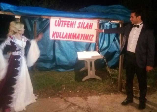 Samsun'un Bafra ilçesine bağlı Gökçeağaç Mahallesi'nde gelin ile damat pankart asarak düğünlerinde silah attırmadı. GÖKDER'in Bafra'da başlattığı "Silah atma, kan dökme, can alma, katil olma, adam ol, mermi parasını geline tak evine tencere alsın" isimli kampanyaya bir destek de mahallede gece düğünü yapan Burcu-Serkan Kartal çiftinden geldi. Gelin ve damat, düğün alanının farklı yerlerine astıkları "Lütfen silah kullanmayınız" pankartları ile gelen misafirlerini uyararak silah attırmadılar. GÖKDER'in başlattığı kampanyaya yine aynı köyden bir vatandaş kızının düğününde pankart asarak destek olmuştu.Gelin Burcu Demir, "Derneğimizin çabaları ile başlayan düğünlerde silaha hayır kampanyası sayesinde korkmadan birine bir şey olacak mı endişesi yaşamadan huzurlu bir şekilde güzelce düğünümüzü yaptık. Bütün yeni evlenecek çiftlere de tavsiyemiz düğününüzde silah attırmayın ki, en güzel gününüz kabusa dönmesin" dedi.Silaha hayır kampanyasını yürüten GÖKDER'in başkanı Turgut Demir ise, "Kampanya başladığından beri düğünlerde silah atma olayı belirgin bir şekilde azaldı. Vatandaş biraz daha bilinçlendi. Artık düğün sahibine şunu söyleyebiliyor: 'Silah atarsan ya da attırırsan düğününden kalkar giderim.' Bu çok önemli bir aşama. Umuyoruz bir yıl içinde vatandaşlarımızın da duyarlılığı ile bu ilkel silah magandalığını bitireceğiz" diye konuştu. Düğün sahibi Erol Demir, "Bu gece gördüm ki eskiden silahla yapılan düğünlerden, silahsız yapılan düğünler çok daha huzurlu. Hem konuklar rahat etti hem de biz birine bir şey olacak mı korkusu yaşamadık" ifadelerini kullandık. Düğüne katılan misafirler ise bu kampanyayı düzenleyenlere teşekkür ettiler. (Ahmet Şükrü Uluçay /İHA)