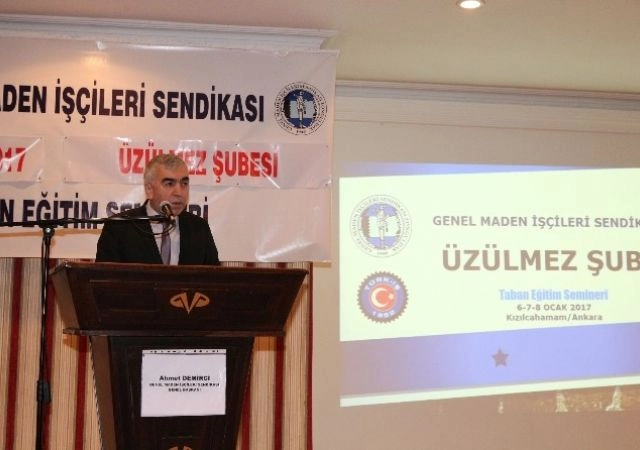 Genel Maden İşçileri Sendikası'na (GMİS) bağlı Karadon, Armutçuk, Kozlu, Üzülmez, Amasra, Merkez, MTA Şubelerinin taban eğitim seminerleri Ankara Kızılcahamam'da devam ediyor.GMİS Üzülmez Şube Taban Eğitim Semineri 5-6-7 Ocak tarihlerinde Kızılcahamam Patalya Otel'de gerçekleştirildi.Yeni yılın ilk günü yaşamını yitiren GMİS Genel Sekreteri Hakkı Arslan'nı zamansız kaybetmiş olmanın acısının yaşandığı seminere GMİS Genel Başkanı Ahmet Demirci, Genel Başkan Yardımcısı İsa Mutlu, Genel Mali Sekreteri Adnan Tıska, Genel Teşkilatlandırma ve Eğitim Sekreteri Satılmış Uludağ, Sendikamız Üzülmez Şube Başkanı Tayfun Demir ve Şube Yöneticileri ile TTK Üzülmez Müessesesinde çalışan 124 maden işçisi katıldı.Demirci; "Krizin faturasının işçilere ve emekçilere kesilmesine için vermeyeceğiz"Seminerin Sunuş konuşmasını yapan Genel Başkan Ahmet Demirci, TTK'da çalışan maden işçilerini kapsayan Taban Eğitim Seminerlerinin ilk 3'üne rahatsızlığına rağmen büyük özveri ile katılan ve yeni yılın ilk günü yaşamını yitiren Genel Sekreter Hakkı Arslan'ı zamansız kaybetmenin acısı ile 4. semineri gerçekleştirdiklerini vurguladı.Demirci konuşmasında şunları söyledi."Burada yaptığımız üç eğitim seminerine, rahatsızlığına rağmen katılan ancak bugün aramızda olmayan değerli kardeşim, Genel Sekreterimiz Hakkı Arslan'ı rahmetle anıyorum.Genç yaşta aramızdan ayrılan; delege, temsilci, şube yöneticisi, şube başkanı ve Genel Sekreter olarak uzun yıllar madenci kardeşlerimize hizmet eden Hakkı Arslan'ı kaybetmek hepimizi derinden üzdü. Muhtarlık, siyaset, spor yöneticiliği gibi her alanda sosyal faaliyetleri bulunan tecrübeli bir sendikacı olan ve TÜRK-İŞ Bartın İl Temsilcisi olarak görev yapan Hakkı kardeşimiz bu zorlu dönemde bizi yalnız bıraktı. Ailesine, dostlarına, Genel Maden-İş camiamıza, madenci kardeşlerimize başsağlığı ve sabır diliyorum.Kendisine Allah'tan rahmet diliyorum.Onu mücadelemizde yaşatacağız.Sendikamızı bugünlere taşıyan başta Rahmetli Genel Başkanımız Şemsi Denizer olmak üzere tüm yöneticilerimizi sevgi, saygı ve şükranla anıyorum.Karadon Gelik'te hafta içi meydana gelen iş kazasında kaybettiğimiz Ayhan Badurlu kardeşimiz başta olmak üzere, bundan tam 4 yıl önce, 7 Ocak 2013 tarihinde Kozlu'da taşeron şirkette çalışırken kaybettiğimiz 8 arkadaşımıza ve tüm maden şehitlerimize Allah'tan rahmet, yakınlarına başsağlığı ve sabır diliyorum.Terör şehitlerimizi de rahmetle anıyor, terörü bir kez daha şiddetle lanetliyorum.İçerideki ve dışarıdaki karanlık odaklar asla bizi korkutamayacak, yıldıramayacak ve kardeşliğimizi bozamayacaktır.Değerli arkadaşlarım,Türkiye, Zonguldak, Karabük, Bartın, Türkiye Taşkömürü Kurumu, Maden Tetkik Arama Kurumu, özel sektör işyerlerimiz ve örgütlenme mücadelesi verdiğimiz işyerlerimiz dahil her birinin ciddi sorunları var.Komşularımızda savaş var ve biz de savaşın içindeyiz.Yıllardır ülke içinde mücadele ettiğimiz terör yeni yandaşlarla devam ediyor.Terör ve savaş derken ekonomik kriz gözden kaçsa da asgari ücret tespiti ile tekrar hatırladık.Zonguldak biliyorsunuz göç veriyor. Çünkü, TTK da küçülmeye devam ediyor.Hepinizin yakından takip ettiği gibi TTK'da, Karadon'dan düğmeye basarak bir özelleştirme adımı atılmak istendi.Tek yürek, tek ses olduk. Tavrımızı ortaya koyduk ve geri çekilmek durumunda kaldılar.15 Temmuz darbe girişimiyle doğan olağanüstü şartlarda soruna çözüm üretmeye çalışıyoruz.Hükümet her fırsatta yerli kaynaklarımızı kullanmaktan söz etse de TTK'ya ve MTA'ya işçi alınmıyor, emeklilikler devam ediyor.Genel Maden-İş yönetimi olarak iktidarı ve muhalefetiyle tüm kapıları zorluyoruz.Son olarak sendikamızı ziyaret eden Başbakanımıza durumu anlattık, çözüm önerilerimizi sunduk.Enerji ve Tabii Kaynaklar Bakanı ve Cumhurbaşkanımızla görüşmenin yollarını arıyoruz.Ne yazık ki iktidar partisi Zonguldak Milletvekillerinden gereken desteği alamıyoruz. Üçü bir araya gelip Ankara'da bize kapı açamıyorlar.TTK'ya ve MTA'ya işçi alınması için tüm şartları zorluyoruz, zorlamaya da devam edeceğiz.Örgütlenme çalışmalarımız sürüyor. Aydın Çine'de örgütlendik.Arkadaşlarımızın bir kısmı işten atıldı. Diğerlerinin istifa etmesi için işveren baskı yapıyor.Arkadaşlarımızın bir kısmını son seminerimize, buraya çağırdık.Örgütlenme çalışmalarımız kesintisiz sürecek.TTK, MTA ve HEMA işyerleri için Toplu İş sözleşmeleri hazırlıklarımızı tamamladık.En kısa sürede TİS görüşmelerine başlayacağız.Her sözleşme döneminde olduğu gibi yine savaş ve kriz bahaneleri var.Değerli arkadaşlarım,Krizin faturasının işçilere ve emekçilere kesilmesine için vermeyeceğiz.İşimize, aşımıza, işyerimize ve geleceğimize hep birlikte sahip çıkacağız.Kendi çözüm önerilerimizi her ortamda, her fırsatta anlatmaya devam edeceğiz.Genel Maden İşçileri Sendikası olarak şanlı bir tarihimiz var.Bölge insanı olarak tecrübelerimiz var.26 yıl önce bugünlerde, o zor şartlarda nasıl anlattıysak, yine hep birlikte anlatmanın yollarını bulacağız.Bu seminer programımızın yolumuzu aydınlatmasını diliyorum.Çok değerli hocalarımız var. Dersleri dikkatle dinleyecek ve değerlendirme toplantısında hepimiz tecrübelerimizi ortaya koyarak mücadele gücümüze güç katacağız.Öğreneceğiz ve çevremize anlatacağız.Seminer programını hazırlayan maddi, manevi şartları oluşturan tüm yönetim kurulumuza ve personel arkadaşlarıma huzurlarınızda bir kez daha teşekkür ediyorum.Ve tabii ki yazışmaları ve görüşmeleri yapan Rahmetli Genel Sekreterimiz Hakkı Arslan'ı şükranla anıyorum.İnşallah onun emekl