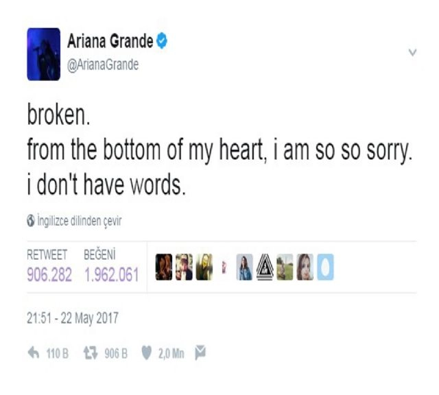 ABD'li ünlü pop sanatçısı Ariana Grande, Manchester'daki saldırıya ilişkin Twitter hesabından, "Kalbim derinden kırıldı" mesajını yayınladı. İngiltere'nin Manchester kentinde, ABD'li ünlü pop sanatçısı Ariana Grande'nin konseri sonrasında bombalı saldırı meydana gelmişti. DEAŞ'lı 22 yaşındaki Salman Abedi'nin gerçekleştirdiği saldırıda 22 kişi hayatını kaybederken 59 kişi de yaralanmıştı. Pop sanatçısı Ariana Grande, saldırıya ilişkin Twitter hesabından, "Kırıldım. Kalbim derinden kırıldı. Çok üzgünüm söyleyecek söz bulamıyorum" dedi.