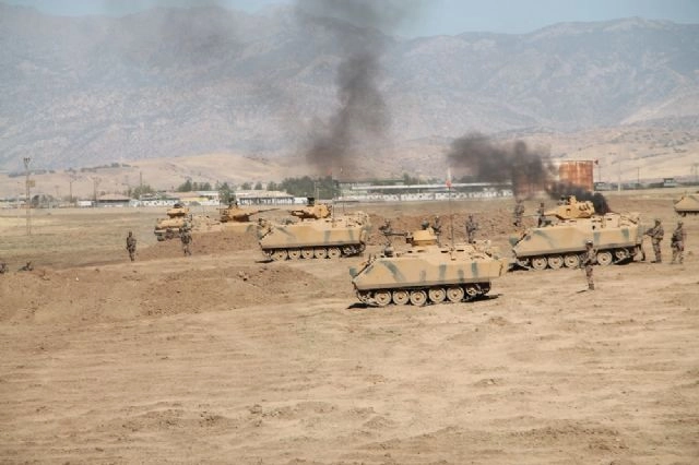 Şırnak'ın Silopi ilçesi Habur Sınır Kapısı yakınlarındaki tatbikat 31'inci gününe girdi. Tatbikata çıkan askerler temsili düşman hedeflerini imha etti. Türk Silahlı Kuvvetleri tarafından Habur Sınır Kapısı yakınlarındaki tır parkının karşısındaki alanda 18 Eylül'de başlatılan tatbikat devam ediyor. Zırhlı birlikler ve askerlerin yaya intikal gerçekleştirdiği tatbikatta temsili düşman hedefleri kuşatıldı. Hava taarruzunun yakılan lastikleri ile engellenmesinin ardından zırhlı birlikler ile kuşatma yapıldı. Temsili hedeflerin işgalinin ardından zırhlı birlikler ve askerler birliklerine geri çekildi. (Ayaz Müldür/İHA)