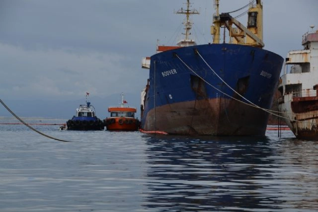 İzmir'in Aliağa ilçesinde hacizli "Bodyer" adlı kuru yük gemisinden denize litrelerce yakıt sızdı. Edinilen bilgiye göre, Aliağa'nın Karadut mevkisinde hacizli olarak demirli bulunan 5 gemiden biri olan 97.8 metre boyunda, 3 bin 936 grostonluk Türk bayraklı, 'Bodyer' isimli kuru yük gemisinin akaryakıt tankından litrelerce yakıt denize sızdı. Aliağa Liman Başkanlığı yetkililerine haber verilmesi üzerine ekipler, geminin yanına giderek sızan yakıttan daha fazla bölgenin zarar görmemesi için, geminin etrafını bariyerlerle çevirdiler. Mürettebatın bulunmadığı gemi çevresinde ekiplerin aldığı önlemler sürerken, gemideki yakıtın tahliye edilmeye başlandığı öğrenildi.(Nimet Ergün/İHA)