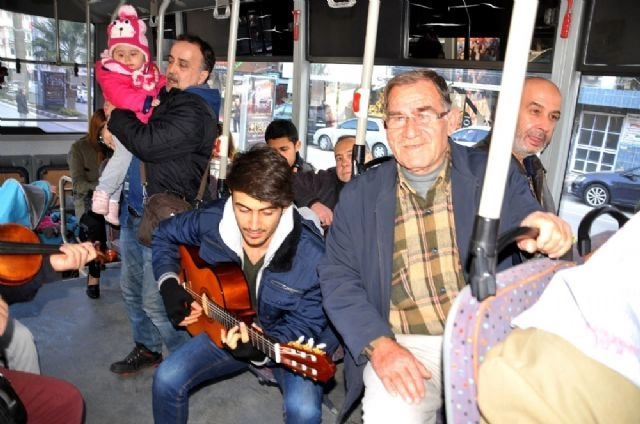 Manisa'da halk otobüsü şoförlüğü yapan ve aynı zamanda belediye korosunda solist olan Emrullah Şahin, canlı müzik eşliğinde karşıladığı yolcularına Türk Sanat Müziği ziyafeti yaşattı. Manisa'da Terminal-OSB hattı arasında sefer yapan 1 Nolu halk otobüsüne binen yolcular, sazlı sözlü seyahat etti. Yunusemre Belediyesinin kurduğu koroda solist olan ve aynı zamanda halk otobüsü şoförlüğü yaparak geçimini sağlayan Emrullah Şahin, müzisyen arkadaşlarıyla birlikte yolcularına sürpriz yaptı. Müzisyen arkadaşlarını da yanına alarak hat seferine çıkan Emrullah Şahin, yolcularını canlı müzik eşliğinde karşıladı. Kısa bir süre yaşadıkları şaşkınlık sonrası otobüse binen yolculara, Türk Sanat Müziğinin birbirinden değerleri eserlerini seslendiren Şahin, kulakların pasını sildi. Müzisyenler Osman Özdamarlar, Hüseyin Yıkın, Mertcan Özdemir ve Şafak Uyar'ın eşliğinde "Sefalar Getirdiniz", "Akşam Güneşi", "Gülü Susuz Seni Aşksız Bırakmam", "Kapıldım Gidiyorum" şarkıları başta olmak üzere sevilen Türk Sanat Müziği şarkılarını 10 kilometrelik yolculuk boyunca yolcularına canlı söyleyen şoför Emrullah Şahin'in bu sürprizi, vatandaşlardan da tam not aldı. Yol boyunca Şahin'in söylediği şarkılara kimi zaman eşlik eden yolcular, ilk defa böyle bir yolculuk yaptıklarını ve çok memnun olduklarını söyledi. Yunusemre Belediyesinin bir buçuk yıl önce hayata geçirdiği koroda solistlik yapan evli 2 çocuk babası genç halk otobüsü şoförü Emrullah Şahin, yolcularının günlük yaşam stresinden biraz uzaklaşması adına böyle bir çalışmayı yaptığını belirterek, "Yolcular otobüse binerken tüm dertleri ve sorunlarıyla biniyor. Yolculara bu şekilde müzik eşliğinde hizmet vermek çok güzel bir şey. Sevdiğim müziği insanlarla böyle paylaşmak beni ayrıca mutlu ediyor. Umarım keyif alırlar" dedi.Manisa Özel Halk Otobüsleri Motorlu Taşıyıcılar Kooperatifi Başkanı Erdoğan Akatmaca da son günlerde şoförlerin seyahat hizmetiyle birlikte özellikle hasta yolcuları hastaneye yetiştirmeleriyle de anıldığını belirterek, gerektiği zaman ambulans görevi de gördüklerini ve duyarlı şoförlere sahip olduklarını söyledi. Emrullah Şahin'in çok güzel bir sesi olduğunu ifade eden Akatmaca, içlerinde sanatçıların da olduğunu sözlerine ekledi.(Önder Aydın/İHA)
