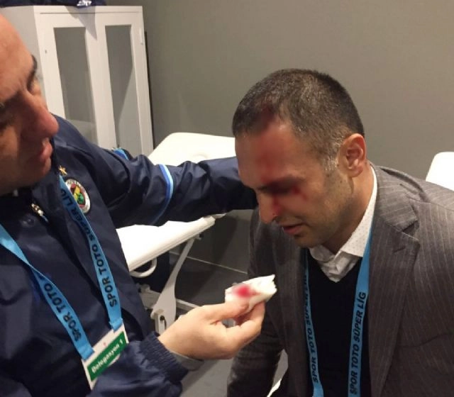 Fenerbahçe İdari Menajeri Hasan Çetinkaya'nın kafası yarıldı. Karşılaşmanın bitiş düdüğüyle birlikte soyunma odasına yönelen Çetinkaya'ya tribünden gelen bir cisim isabet etti.