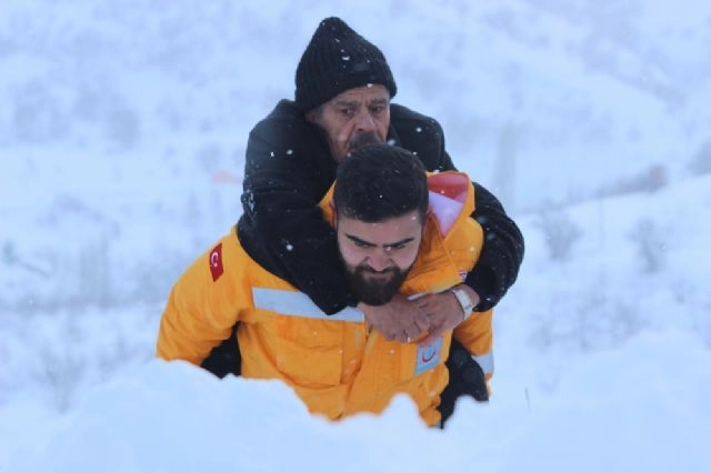 Konya'nın Hadim ilçesinde hasta ihbarına giden 112 Acil Servis ekipleri, ilçedeki yoğun kar nedeniyle 66 yaşındaki hastayı ambulansa kadar sırtında taşıdı. Hadim ilçesi Hocalar Mahallesi'nden hasta ihbarı alan sağlık ekipleri, istasyonda bulunan kar paletli ambulansla olay yerine doğru hareket etti. Hastaya bir an önce müdahale etmek için yola çıkan sağlık çalışanları, ilçe merkezinde 2 metreyi aşan karda zor anlar yaşadı. Olay yerine varmakta güçlük çeken ekip, paletli ambulansla yolda mahur kaldı. Ekipler, bölgede kar temizleme çalışması yapan Hadim Belediyesine ait olan kar küreme aracı tarafından saplandığı yerden kurtarıldı. Ardından tekrar yola koyulan ekipler, tansiyon ve şeker hastası olan 66 yaşındaki Mevlüt Çakmak'ı evinin bahçesinde karlar içinde yatarken buldu. İlk müdahaleyi olay yerinde yapan sağlık çalışanları, yoğun kar yağışı sebebiyle hastayı sedye ile taşıyamadı. Bunun üzerine ekipte görevli Samet Kuz ve Uğur Gök önce hastayı itfaiye usulü taşımayı denedi. Ancak kar kalınlığı ve buzlanma nedeniyle başaralı olamayan görevlilerden Samet Kuz 66 yaşındaki Mevlüt Çakmak'ı sırtına aldı. Ambulansa kadar taşınan hasta, Hadim Devlet Hastanesine kaldırılarak tedavi altına alındı. Çakmak'ın durumunun iyi olduğu öğrenildi.