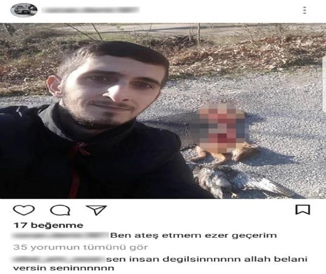 Sakarya'nın Akyazı ilçesinde aracıyla ezerek parçaladığı tilki ve doğanla fotoğraf çekilerek 'Ben ateş etmem ezer geçerim' sözüyle sosyal medyada paylaşan genç, hayvanseverlerin tepkisine neden oldu. Gencin tepki çeken fotoğrafları hesabından sildiği görüldü. Sakarya'da yaşanan vicdansızlık hayvanseverleri ayağa kaldırdı. Akyazı ilçesinde yaşadığı öğrenilen Ö.D., kendi aracıyla ezerek parçaladığı tilki ve silah ile vurulmuş doğanın fotoğrafını sosyal medya hesabına yükledi. Aracının önünde cansız şekilde duran doğan fotoğrafını "Sabah Kuşu bu olsa gerek" açıklamasıyla, üzerinden geçilerek paramparça olmuş tilki fotoğrafını ise "Ben ateş etmem ezer geçerim" notları ile paylaşan Ö.D., Sakarya'daki ve tüm ülke genelindeki hayvanseverleri adeta çıldırttı.Bunu yapanın ceza alması gerektiğini söyleyen hayvanseverler, paylaşılan fotoğrafların suç teşkil ettiğini söyleyerek, yetkililerden konuyla ilgili gerekli işlemlerin yapılmasını istediler.Öte yandan, Ö.D.'nin gelen tepkiler üzerine paylaştığı fotoğrafları sosyal hesabından kaldırdığı ancak diğer fotoğrafların altına tepkilerin yağdığı görüldü.