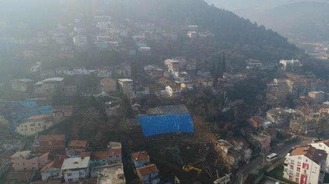 Bursa'da, Mollaarap Mahallesi'ndeki heyelan bölgesi drone ile havadan görüntülendi.