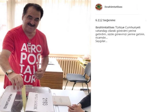 Anayasa değişikliği için gerçekleştirilen halk oylaması kapsamında sandığa giden ünlü sanatçı İbrahim Tatlıses, vatandaşlara 'oy kullanın' çağrısı yaptı. Tatlıses, sandık başında çekilen fotoğrafını sosyal medyada takipçileriyle paylaştı.