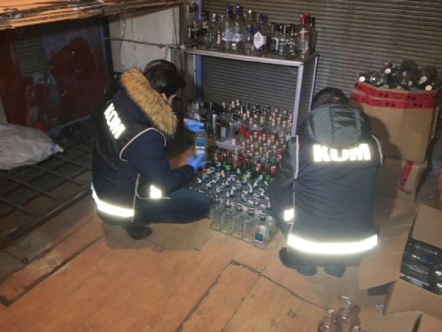İstanbul Fatih'te Kaçakçılık Suçlarıyla Mücadele Şube Müdürlüğü ekiplerince aynı sokaktaki 3 ayrı adrese düzenlenen operasyonda 500 litre metil alkol ve binlerce şişe sahte içki ele geçirildi. Operasyonda 2 kişi de gözaltına alındı.Fatih'te yılbaşı öncesinde İstanbul Emniyet Müdürlüğü Kaçakçılık Suçlarıyla Mücadele Şube Müdürlüğü ekiplerince düzenlenen operasyonla 120 bin adet doldurulmuş sahte içki şişesi ele geçirilmişti. Ekiplerin çalışması ve ihbarların değerlendirilmesi üzerine aynı sokak üzerinde bulunan 3 ayrı adrese de bugün yeniden operasyon düzenledi. Gerçekleştirilen operasyonda, 500 litre metil alkol, bin adet doldurulmuş sahte içki, 10 bin adet içki şişesi, yerli bandroller ve içki şişesi kapakları ele geçirildi. Sahte içki imalatı yaptığı şüphesiyle iki kişi de gözaltına alındı. Gözaltına alınan şüpheliler sorgulanmak üzere emniyete götürülürken, el konulan sahte içki ve şişeler kamyonete yüklendi.(Caner Sönmez /İHA)