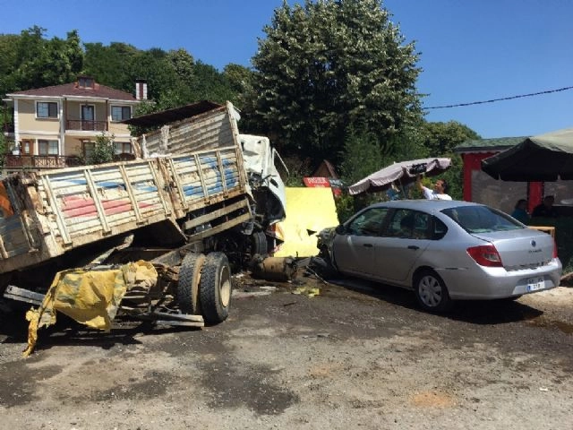 İstanbul Beykoz'da bilinmeyen bir nedenle kontrolden çıkan hafriyat yüklü kamyon bir araca çarptı. Kamyonun çarptığı otomobile 10 dakika önce akü takviyesi yaptığı öğrenilen bir aile ezilmekten kıl payı kurtuldu. Kamyonun aynı yerde bulunan çay bahçesine 1 metre kala durmasıyla facianın eşiğinden dönülürken kamyon şoförünün ise ağır yaralandığı öğrenildi.Beykoz Elmalı'da bilinmeyen bir nedenden dolayı kontrolden çıkan hafriyat dolu kamyon park halindeki bir araca çarptı. Kamyonun çarptığı otomobile 10 dakika önce 5 kişilik bir ailenin akü takviyesi yaptığı öğrenildi. Aile kazadan kıl payı kurtulurken, kamyon şoförü Hanefi Akyasan ağır yaralandı. Yaralı şahıs olay yerine çağrılan ambulansla hastaneye kaldırılarak tedavi altına alındı.FRENİ PATLAYAN KAMYON ÇAY BAHÇESİNE 1 METRE KALA DURDUOtomobile çarpan hafriyat yüklü kamyon hemen yan tarafta bulunan çay bahçesine girmeden durdu. Kamyonun çay bahçesine yaklaşık 1 metre kala durması olası bir faciayı önledi. Çay bahçesinde oturanlar ise büyük panik yaşadı.Kazayı gören bir vatandaş, "Rampadan indiği sırada bir anda kontrolünü kaybedip araca çarptı. Burada böyle kazalar çok oluyor. Etrafta bir sürü çay bahçesi var. Kamyon şoförü yaralandı" dedi. (Mustafa Biçer - Doğan Can Cesur/İHA)