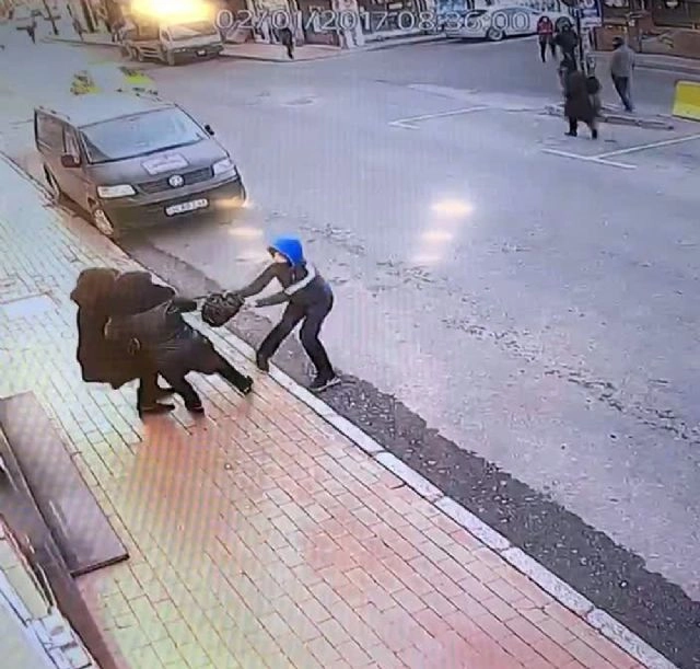 İstanbul Fatih'te bir şahıs caddede yürüyen kadınların çantasını kapkaç yapmak istedi. Kadınların çantayı bırakmaması üzerine kapkaççının hızla kaçtığı o anlar güvenlik kameralarına yansıdı.Fatih'te bir şahıs caddede yürüyen 2 kadının çantasını kapkaç yapmak istedi. Kapkaççının kadınların arkasından gelerek çantasını almaya çalıştığı o anlar güvenlik kameralarına yansıdı. Kamaralara yansıyan görüntülerde 2 kadın caddede yürüyor. Arkalarından gelen bir kapkaççı çantayı almaya çalışıyor. Kadınların çantayı bırakmaması üzerine şahıs çantayı bırakarak hızla kaçıyor.Kadınların olayla ilgili herhangi bir şikayette bulunmadığı öğrenildi.