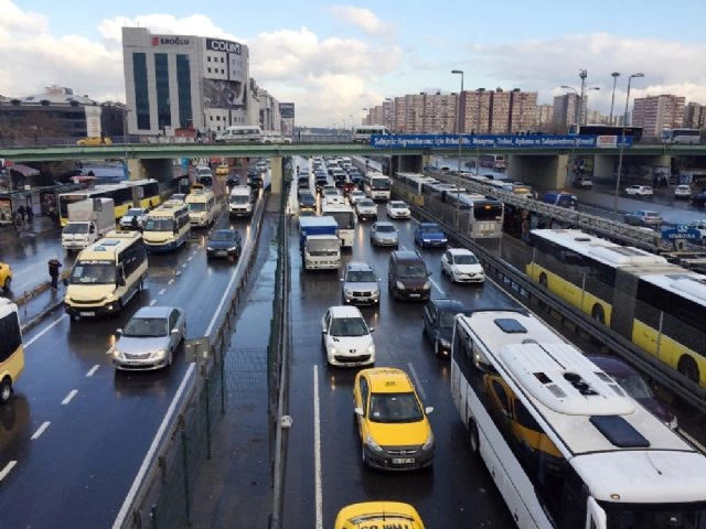 İstanbul'da aralıklarla etkili olan kar yağışıyla birlikte akşam saatlerinde ana arterlerde trafik yoğunluğu oluşmaya başladı. Mesai saatinin bitimiyle trafik yoğunluğu yüzde 70'lere çıktı.