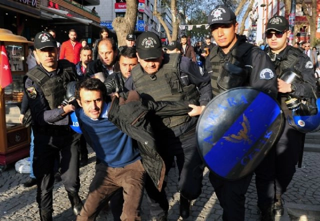 Başkent'te izinsiz bildiri dağıtan gruba polis müdahale etti. Müdahale sonucu 4 kişi gözaltına alındı. Başkent'te Yüksel Caddesi üzerinde izinsiz bildiri dağıtan bir grup, polis ekipleri tarafından uyarıldı. Ekipler, gruba yaptıkları işin yasal olmadığını, dağıtıma son vermemeleri durumunda müdahale edecekleri yönünde ikazda bulundu. Polisin uyarılarını dikkate almayan gruba çevik kuvvet ekipleri müdahale etti. Müdahale sonucu 4 kişi gözaltına alındı.(Musa Erdoğan - Ömer Çetin - Uğur Kan Yüksek/İHA)