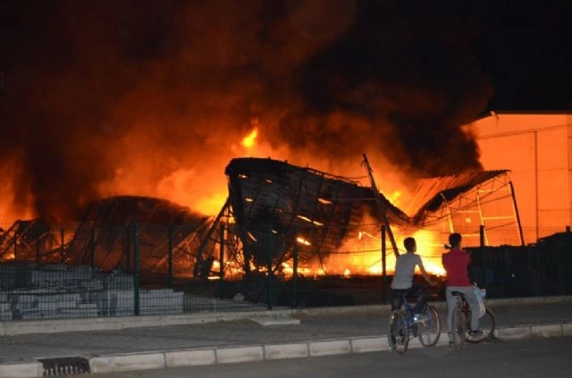 İzmir'in Selçuk ilçesinde sebze ve meyve üreticilerinin kullandığı dükkanlara ait boş kasa deposunda çıkan yangın çıktı.