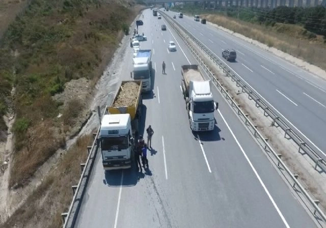 Jandarma ekipleri tarafından Eyüp Kemerburgaz yolu üzerinde hafriyat kamyonlarına yönelik yapılan trafik uygulaması drone ile görüntülendi.
