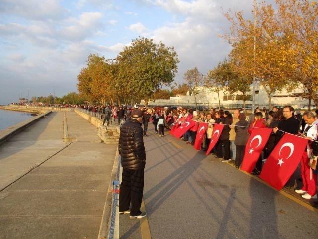 Mustafa Kemal Atatürk'ün ebediyete intikalinin 79'uncu yılında binlerce Kadıköy'de "Ata'ya saygı zinciri oluşturdu. Saat 09.05'te sirenlerin çalmasıyla bazı vatandaşlar gözyaşlarına boğuldu.Kadıköy Belediyesi tarafından Mustafa Kemal Atatatürk'ün 79'uncu ölüm yıldönümü dolayısıyla düzenlenen "Ata'ya Saygı Zinciri"ne binlerce vatandaş katıldı. Fenerbahçe Orduevi ile Bostancı Sahili arasında bir araya gelen vatandaşlar, el ele tutarak yaklaşık 6.5 kilometrelik zincir oluşturdu.CHP Milletvekilleri Gürsel Tekin ve Barış Yarkadaş, Kadıköy Belediye Başkanı Aykurt Nuhoğlu da vatandaşlarla birlikte Ata'ya saygı zinciri oluşturdu. Ellerinde Türk bayraklarıyla el ele tutuşan binlerce vatandaş, saat 09.05'i gösterdiğinde sirenlerin çalmasıyla birlikte saygı duruşuna geçti. Sirenlerin duyulmasıyla bazı vatandaşlar hüzünlenerek, gözyaşlarına boğuldu.Denizde bulunan jet ski ve tekneler de Türk bayrakları ile saygı duruşunda bulunurken, bir paraşütçü ise gökyüzünde Türk bayrağı açtı.BAŞKAN NUHOĞLU VE CHP MİLLETVEKİLLERİ DE SAYGI ZİNCİRİNE KATILDIKadıköy Belediye Başkanı Aykurt Nuhoğlu, Atatürk'ü saygıyla andığını belirterek, "Atatürk'ü anlamak, değişimin gücünü, bilim ve teknolojiyi, eğitimin önemini, bu ülkenin gelecekte aydınlık yolda yürüyeceğini anlamaktır. Sadece bir günlük anmak değil, bu ülkenin geçmişten geleceğe olan yürüyüşünü anlamaktır" diye konuştu.CHP İstanbul Milletvekili Barış Yarkadaş da yurdun dört bir yanından Atatürk için saygı zinciri oluşturulduğunu ifade ederek, "Bugün Mustafa Kemal'e olan sevgimizi oluşturduğumuz insan zinciriyle bir kez daha gösteriyoruz. Türkiye'nin dört bir yanını çevreleyen zincirini ilk halkasıdır burası. Mustafa Kemal'i tabi ki büyük bir yasla anıyoruz ama bir yandan da onun bize bıraktığı ilkeleri ve mirası yaşatmak, gelecek kuşaklara aktarmak için de mücadele ediyoruz" dedi.Çok duygulu olduğunu belirten bir vatandaş, "Özellikle biz kadınlar için bugün özgür, rahat yaşamamızı sağladı. Hem heyecanlı hem gururluyum. Bir o kadar da hüzünlüyüm" ifadelerini kullandı.Saygı duruşunun ardından vatandaşlar, İstiklal Marşı ve 10'uncu Yıl Marşı'nı söyledi.(Metin Başar/İHA)