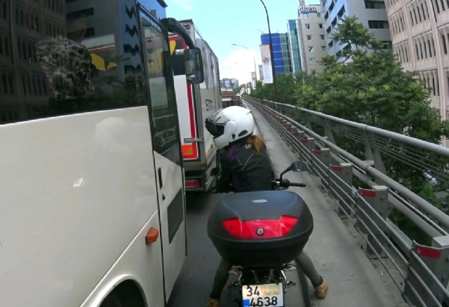 Mecidiyeköy'de otobüs sürücüsü trafikte durduğu sırada kapısını kapatıp açınca, arkasından seyir halinde olan motosikletli kadının tepkisi ile karşılaştı. Kadın sürücü otobüsün kapısını yumruklayıp tepki gösterirken, yaşanan o anlarda başka bir motosikletlinin kask kamerasına yansıdı.Mecidiyeköy'de trafikte seyir halinde olan bir otobüs sürücüsü, trafiğin durduğu sırada kapısını açıp geri kapattı. Bu sırada arkasında seyir halinde olan bir motosiklet sürücüsü kadında geçmek için kapının kapanmasını bekledi. Otobüsün yanından geçen kadın sürücü, otobüsün kapısını yumruklayarak, "Yolun ortasında kapını neden açıyorsun" diye tepki gösterdi. Daha sonra kadın sürücü yoluna devam ederken, yaşanan o anlar ise başka bir motosikletlinin kask kamerasına yansıdı.Görüntülerde, bir motosikletli sürücüsü kadının trafikte seyir halinde olduğu ve trafikte olan bir otobüs sürücüsünün de kapısını açıp kapattığı görülüyor. Kapı kapandıktan sonra otobüsün yanından geçen kadın sürücüsü otobüsün kapısına vurarak tepki göstermesi yer alıyor.