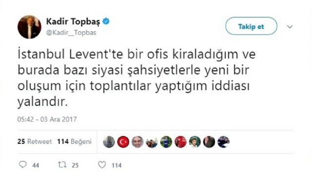 Eski İstanbul Büyükşehir Belediye Başkanı Kadir Topbaş, Levent'te ofis kiralayıp yeni bir oluşum içinde olduğu iddialarını yalandı. Eski İstanbul Büyükşehir Belediyesi (İBB) Başkanı Kadir Topbaş, hakkında çıkan Levent'e ofis kiralayıp yeni bir oluşum içinde olduğu iddialarına sosyal medya hesabı üzerinden yalanladı. Sosyal medya üzerinden açıklama yapan Topbaş, şu ifadelere yer verdi: "İstanbul Levent'te bir ofis kiraladığım ve burada bazı siyasi şahsiyetlerle yeni bir oluşum için toplantılar yaptığım iddiası yalandır. Hukuki haklarım saklı olmak üzere söz konusu iddianın gerçek dışı bir iftira olduğunun bilinmesini isterim."