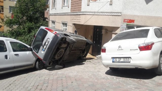 İstanbul Kağıthane'de dik yokuşta park etmeye çalışan araba, bina girişine çarptıktan sonra yanındaki aracın üzerine devrildi. Olay, Kağıthane Yeşilçe Mahallesi Damla Sokak'ta sabah saatlerinde meydana geldi. Sürücü Ersin Kızıl aracını dik bir yokuşun olduğu apartman önüne park etmeye çalıştı. İddiasına göre bir anda debriyaj yerine frene basan Kızıl'ın aracı ilk önce apartman girişine çarptı sonrasına ise sol tarafında bulunan aracın üzerine devrildi. 2 teker üstüne duran araçtan sürücü Ersin Kızıl ise camdan dışarıya çıktı. Bir çocuk parkı yakının da olan olayda etrafta hiçbir çocuğun bulunmaması da olası bir yaralanmayı ve can kaybını önledi.Olay anını anlatan Kızıl, "Debriyaja basmadan frene bastım herhalde fren mi boşaldı artık nasıl olduysa anlamadım bir anda oldu. İçindeydim bende aracın. Yokuş yıkarı çıkıp buraya park etmeye çalışıyordum. Camdan çıktım sonra itfaiyeyi polisi çağırdım"dedi.(Murat Delice/İHA)