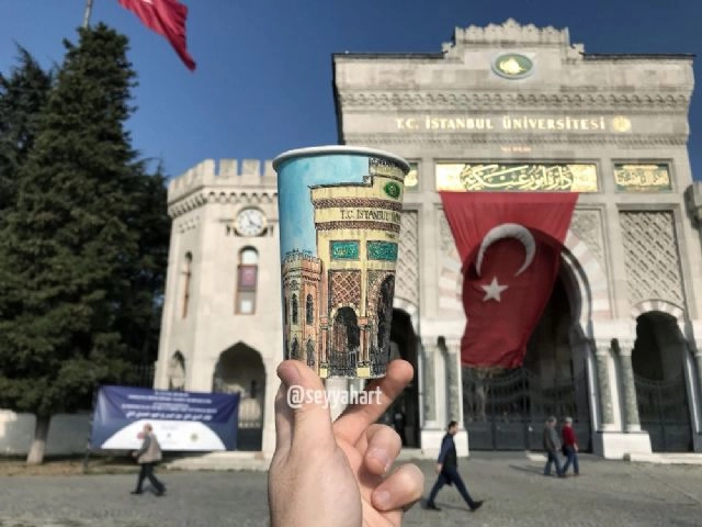 Çoğu zaman içip attığımız kahve bardaklarına çizdiği resimleri satarak 19 ülke gezen İstanbullu maceraperest şimdi de yaşadığı şehri bardaklara çizdi.