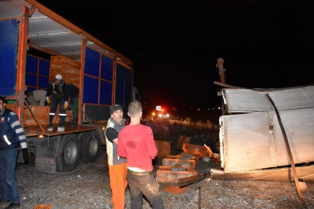 Balıkesir'in Dursunbey ilçesinde meydana gelen trafik kazasında bir TIR'a bağlı tavuk yüklü römork araçtan ayrılarak takla attı. Kazada çok sayıda tavuk telef oldu.Edinilen bilgiye göre, Dursunbey-Balıkesir yolu ilçe girişinde meydana gelen trafik kazasında, 10 SB plakalı TIR'ın arkasında bulunan tavuk yüklü römork bir anda araçtan ayrıldı. Yolun kenarında bulunan şarampole devrilen römorkta bulunan çok sayıda tavuk telef oldu. Kaza sonrası olay yerinden geçen vatandaşlar seferber olurken, yan yatan römorkun içinde kasalarda bulunan tavuklar başka bir TIR'a aktarıldı.Polis kaza ile ilgili inceleme başlatırken, TIR'da 2 bin 500 tavuğun taşındığı bildirildi.(Hüdayi Demirhan/İHA)
