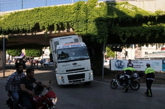 Adana'da 3 metre 50 santim yüksekliğindeki metro köprüsü altına sıkışan kamyon, çekici yardımı ile çıkartıldı. Edinilen bilgiye göre, yüklediği sebzeleri İzmir'e götürmek üzere yola çıkan Yaşar K. idaresindeki 01 GH 646 plakalı kamyon, Seyhan ilçesi Bakımyurdu Caddesi ve Güneykuşak Bulvarı'nın kesiştiği kavşakta 3 metre 50 santim yüksekliğindeki metro köprüsü altından geçmek istediği sırada başka bir araç tarafından sıkıştırıldı. Otomobile çarpmamak için aniden direksiyonu kıran Yaşar K. yönetimindeki kamyon, ağırlığın da etkisiyle köprü altında yana kaydı. Köprüye takılarak devrilmekten kurtulan kamyon, metro köprüsünde sıkıştı. Kentin en işlek caddelerinden biri olan Bakımyurdu Caddesi ve Güneykuşak Bulvarı uzun süre felç oldu. Kamyon olay yerine çağrılan çekici yardımıyla sıkıştığı yerden çıkartıldı. Kamyon sürücüsüne yasak saatte şehir merkezine girmek suçundan 95 lira para cezası kesildi.(Fatih Keçe-Serkan Çetinkaya /İHA)