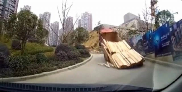 Kamyon yokuşu çıkamadı, ortaya bu görüntü çıktı.Çin'de yokuşu çıkamayan kereste yüklü kamyonun ön kısmı havaya kalktı. Arkaya binen tüm yük de yola devrildi. Görüntülerin kayda alındığı aracın sürücüsü, riski hissetmiş olacak ki kamyonun arkasına hiç yanaşmadı. Yük devrilince de geri manevra yaparak kerestelerden kaçtı.