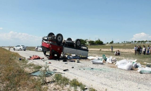 Aksaray'da sürücüsünün direksiyon hakimiyetini kaybettiği kamyonet takla attı. Kazada 1 kişi öldü, 1 kişi de ağır yaralandı. Kaza, Eskil ilçesi Gölbez Yaylası ile Büğrü Yaylası arasındaki yolda meydana geldi. Edinilen bilgiye göre, 42 TR 081 plakalı kamyonetiyle seyir halinde olan Kemal Cevizci, yoldaki çukurdan kaçmak isterken aracın kontrolünü kaybetti. Üzerinde yük bulunan araç yoldan çıkarak şarampole takla attı. Kaza sonucu araçta yolcu olarak bulunan Murat Ünlü (34) ve sürücü Cevizci, kamyonetin altında kaldı. Murat Ünlü kaza yerinde hayatını kaybetti. Olay yerine gelen 112 Acil Servis ekipleri, ağır yaralanan araç sürücüsü Kemal Cevizci'yi hastaneye kaldırdı. Kemal Cevizci'nin durumunun ağır olduğu öğrenildi.Kazayla ilgili soruşturma başlatıldı.(Yasin Can /İHA)
