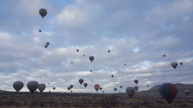 Türkiye'nin önemli turizm merkezlerinden biri olan Kapadokya'da sıcak hava balon turları, 5 günlük aranın ardından bugün yeniden başladı. Türkiye'de ve dünyada balon turizminin başkenti olan Kapadokya'da olumsuz hava şartları nedeniyle, Sivil Havacılık Genel Müdürlüğü tarafından 5 gün boyunca iptal edilen balon turları bugün başladı. Yerli ve yabancı turistlerin büyük ilgi gösterdiği ve sabahın erken saatlerinde başlayan balon turu yaklaşık 1 saat devam etti. (Coşkun Sağlamdin /İHA)