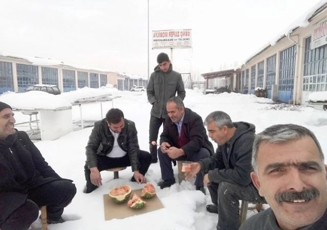 Bingöl'ün Genç ilçesinde yaz aylarında karpuzları kepeğin içinde zula eden esnaflar, kışın kar üstünde karpuz keyfi yapıyor.Genç Küçük Sanayi Sitesinde marangozluk yapan esnaflar, yaz aylarının vazgeçilmezleri arasında yer alan yerli karpuzu dükkanları içerisinde ki kepeğin içinde saklayarak kar yağışının yoğun olduğu dönemde çıkartıp gelen misafirlerine ikram ediyor. Sıcak yaz günlerinin serinletici meyvesi karpuzu kar yağarken yemenin ayrıcalığını yaşamak istediklerini söyleyen sanayi esnafı, "Yaz karpuzu gibi lezzetli olmasa da kış günü, kar altında karpuz yemek de varmış. Biz karpuzları yazın marangoz dükkanımızda ki talaşların arasında saklıyoruz. Kış geldiği zaman ise karpuzları çıkarıp gelen misafirlerimize kar üstünde ikram ediyoruz. Ama yine de her meyvenin kendi mevsiminde tadı oluyor" dedi.