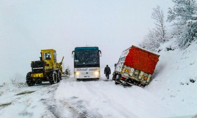 Malatya'da karne dağıtımı için okullarına giden öğretmenlerin de içinde bulunduğu minibüs karda mahsur kaldı. Malatya Büyükşehir Belediyesi ekipleri tarafından kurtarılan öğretmenler okullarına gidemeden geri dönmek zorunda kaldı. Malatya merkezden kırsal kesimde bulunan Porga İlkokuluna gitmek için yola çıkan 5 öğretmenin de içinde bulunduğu köy minibüsü Bürücek Yaylası yolunda yoğun kar yağışı nedeniyle mahsur kaldı. Elektrik arızası için giden elektrik ekibinin de aynı bölgede mahsur kalması ile birlikte durum jandarmaya bildirildi. Jandarmanın durumu Malatya Büyükşehir Belediyesi'ne bildirmesi ile bölgeye yakın bulunan iş makineleri yönlendirildi. Tipi ve yoğun kar yağışının bulunduğu bölgeye ulaşan ekipler, mahsur kalan toplam 16 kişiye ulaştı. Araçlar saplandıkları kardan kurtarılırken içerisinde öğretmenlerin de bulunduğu köy minibüsü yolun kapalı olması nedeniyle il merkezine döndü. Elektrik arıza ekibi ise kesintinin olduğu köye bir kepçenin yardımı ile gitti. Öte yandan, Darende'nin Yenipınar Mahallesi'nde hamile olan ve rahatsızlanan 35 yaşındaki İnsaf Doğan için de zamanla yarışan ekipler hastaya ulaşarak, ambulansla hastaneye sevkini sağladılar. Pütürge-Doğanyol karayolu arasındaki bağlantıyı sağlayan Uzunhüseyin-Karahüseyin grup yolunda mahsur kalan kamyona da ulaşan Büyükşehir ekipleri şoför ve beraberindekileri sağ salim kurtardılar.