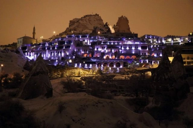 Türkiye'nin önemli turizm merkezlerinden olan Kapadokya bölgesinde karla kaplı peribacaları geceyle birlikte kartpostallık görüntüler oluşturdu. Türkiye'nin önemli turizm merkezlerinden Kapadokya bölgesinde yoğun kar yağışının ardından karlarla kaplanan peribacalarının gece görüntüsü adeta büyüledi. Gecenin karanlığıyla birlikte beyaz örtüyle kaplanan peribacaları kartpostallık görüntüler ortaya çıkardı. (Coşkun Sağlamdin/İHA)