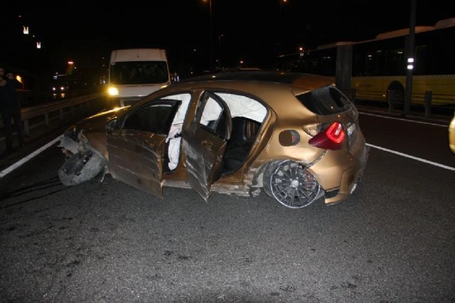 E-5'te kontrolden çıkan otomobil bariyerlere çarpıp takla attı. Araçtakiler aracı bırakıp başka bir araçla kaçtı.Kaza, 04.00 sıralarında D100 karayolu Okmeydanı mevki Edirne istikametinde meydana geldi. Edinilen bilgiye göre, 34 ZLV 78 lüks otomobil makas attığı sırada bariyerlere çarptı. Bariyerlere çarpan araç takla atmaya başladı. Kaza yapan araçta bulunan kişiler başka bir araca binerek olay yerinden uzaklaştı. Kaza ihbarı üzerine olay yerine polis ekipleri sevk edildi. Olay yerine gelen ekipler olası bir kaza yaşanmaması için önlem aldı. Olay yerine gelen çekici ile kaza yapan araç yerinden kaldırıldı."BENİ ÖLDÜRÜYORLARDI, ARABADA YOLCULARIM VARDI"Kaza yapan aracın arkasında bulunan minibüs yola gelen bariyer parçasına çarptı. Bariyer parçasına çarpan minibüsün lastiği patladı. Minibüste çok sayıda yolcu bulunuyordu. Minibüstekiler kazayı yara almadan kurtuldu. Kaza anını anlatan minibüs şoförü Muharrem Sarı, "Araba önümde sağlı, sollu makas ata ata gidiyordu. En sağdan en sola attı kendini. Bariyerlerden takla attı, önüme düştü. Bariyer benim önüme düştü. Bariyerden ben sektim. Bariyer kırıldı. Ondan sonra bu arabadakiler başka arabaya binim kaçtılar. Beni öldürüyorlardı, arabada yolcularım vardı" ifadelerini kullandı.Kaza nedeniyle trafik yoğunluğu oluştu. Aracın çekilmesiyle trafik normal akışına göndü. Kaza ile ilgili soruşturma başlatIldı.(İsmail Bulut/İHA)