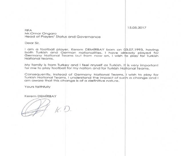 Almanya Bundesliga takımlarından Hoffenheim'de başarılı bir sezon geçiren 23 yaşındaki Türk oyuncu Kerim Demirbay, önce milli takım tercihini Türkiye'den yana kullanırken, 1 saat sonra Almanya Milli Takımı'nda oynamaya karar vermesi büyük yankı uyandırdı. Konuyla ilgili Türkiye Futbol Federasyonu (TFF) bir açıklama yaparak, "Bundesliga takımlarından Hoffenheim'da forma giyen futbolcu Kerem Demirbay'la ilgili sitemizden yapılan açıklama ile eş zamanlı olarak Türkiye Futbol Direktörü Fatih Terim de konuyla ilgili ayrıntılı bilgileri basınla paylaşmıştır.Aşağıda Kerem Demirbay'ın ıslak imzası ile Türk Milli Takımı'nı tercih ettiği belge, yasal sürece sokulmuşken, oyuncu 'son dakika' kararını değiştirdiğini duyurmuştur.Daha evvel Türk Milli Takımı'nda oynamak istediğini beyan eden, bunun için kendisiyle kurulan tüm diyaloglarda tavrını Türk Milli Takımı'ndan yana gösteren oyuncunun son dakika kararını değiştirmesine neden olan gerekçelerine saygı duyuyor ve futbol yaşantısında başarılar diliyoruz" denildi.Daha önce de Mehmet Scholl, Mesut Özil, Murat Yakın gibi isimler başka ülkelerin milli takımlarını tercih etmiş performanslarıyla göz doldurmuşlardı.